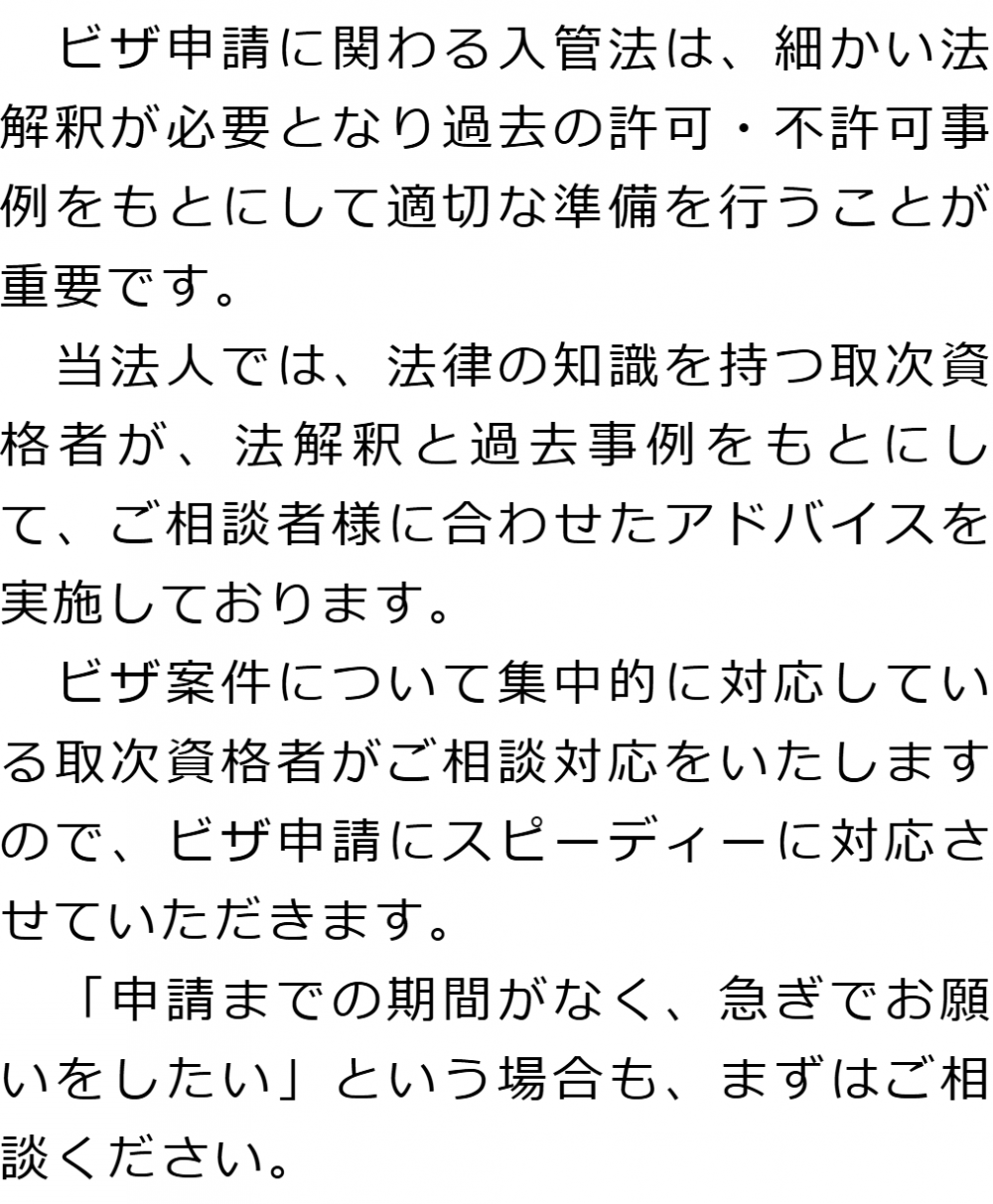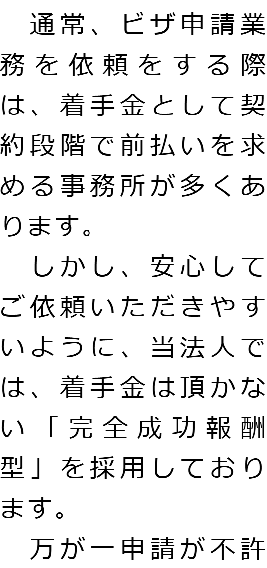 1 初期費用0円!成功報酬制! 2 夜間・土日祝も対応可能 ※要予約 3 ご希望・ご都合に合わせたご相談方法(対面・テレビ電話) 4 申請代行に留まらないアドバイス・書類収集 5 複雑な法令を理解した取次資格者がスピーディーに対応