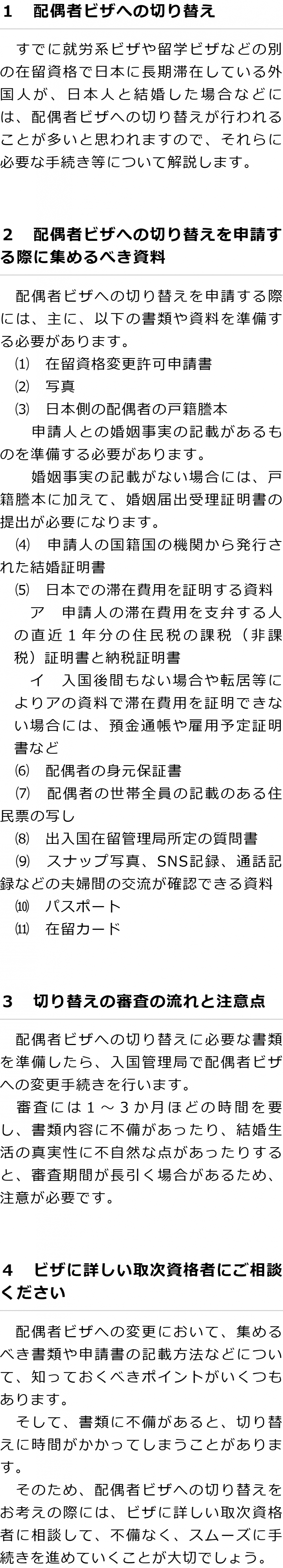 トップこんなお悩みはありませんか?配偶者ビザへ切り替えたい 階層構造▼ こんなお悩みはありませんか?(目次) 配偶者ビザへ切り替えたい こんなお悩みはありませんか?(目次)こんなお悩みはありませんか?トップ配偶者を海外から呼び寄せたい配偶者ビザへ切り替えたい配偶者ビザを更新したい短期滞在ビザから配偶者ビザに変更をしたい留学ビザから配偶者ビザに変更したい配偶者ビザを取得したいが、何をすればいいのか分からない離婚歴があり申請が通るか不安夫婦の年齢に差があり申請が通るか不安収入が少ないため申請が通るか不安ネットで知り合ったが、偽装結婚の疑いからビザが得られるか不安オーバーステイ・犯罪歴があるがどうすればいいか国籍別の結婚手続きについて知りたい 受付時間 平日 9時~21時、土日祝 9時~18時 夜間・土日祝の相談も対応します (要予約) 所在地 〒060-0808 北海道札幌市北区北八条西4‐1-1パストラルビルN8 2F 0120-41-2403 お問合せ・アクセス・地図